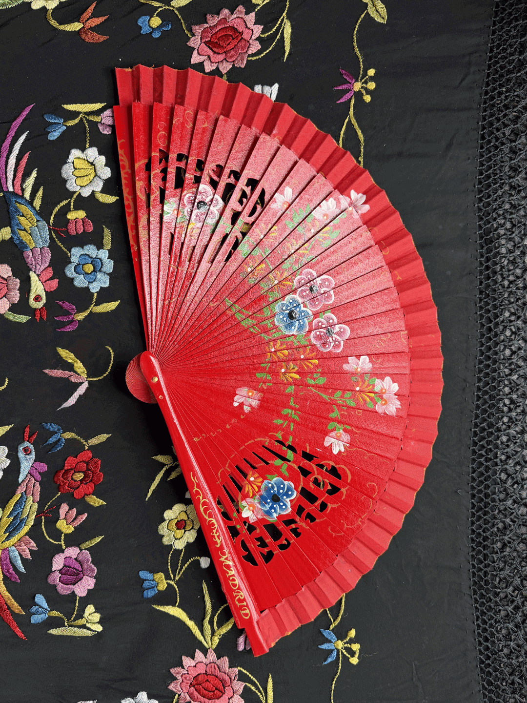 Abanico español de 23 cm pintado a mano de ambos lados. Seleccionado especialmente para baile flamenco.