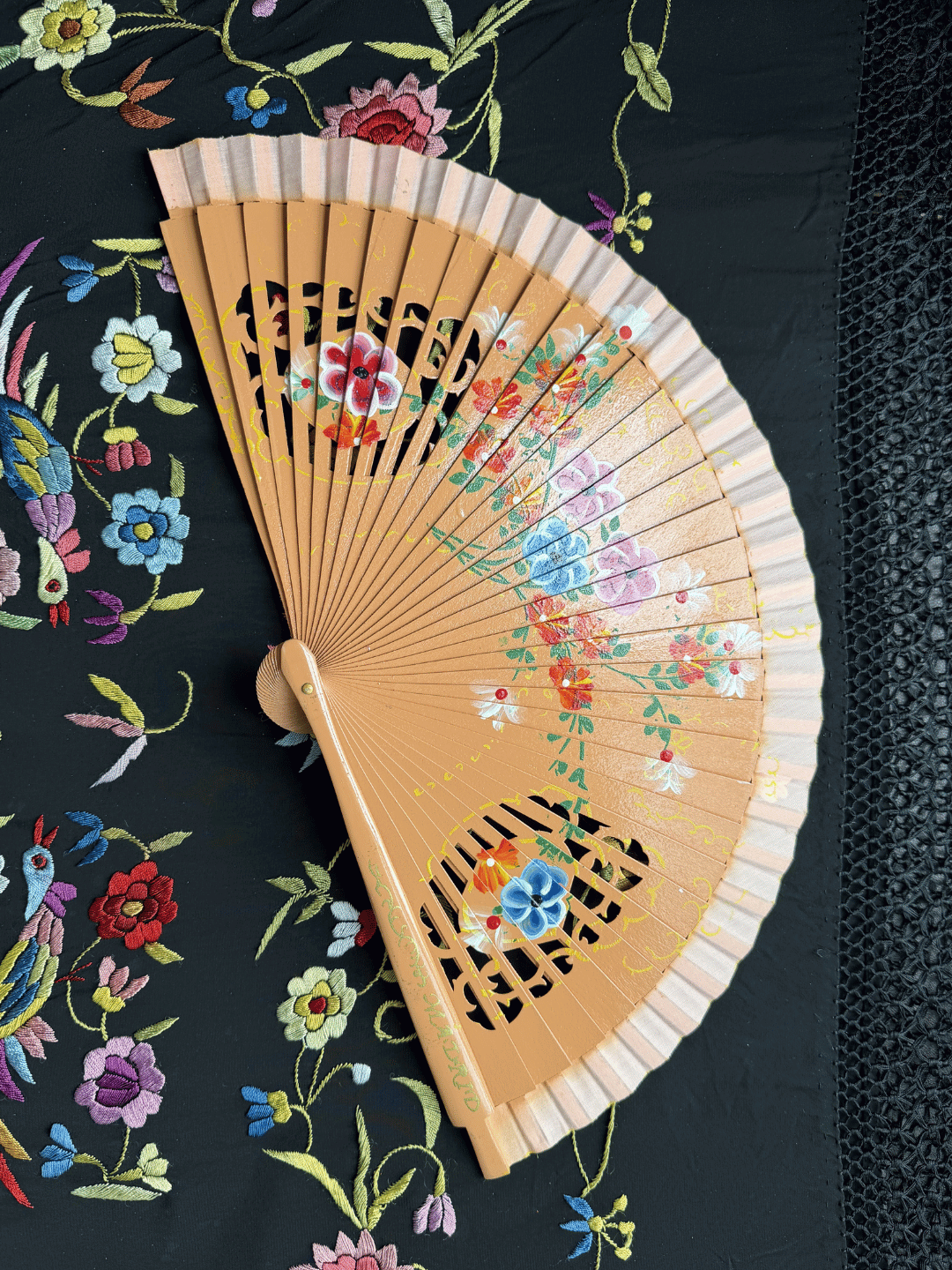 Abanico español de 23 cm pintado a mano de ambos lados. Seleccionado especialmente para baile flamenco.
