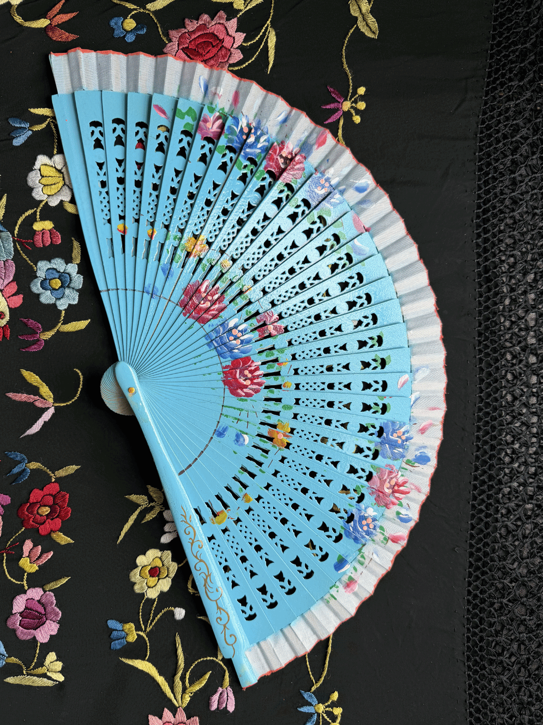 Abanico español de 23 cm pintado a mano de ambos lados. Seleccionado especialmente para baile flamenco.