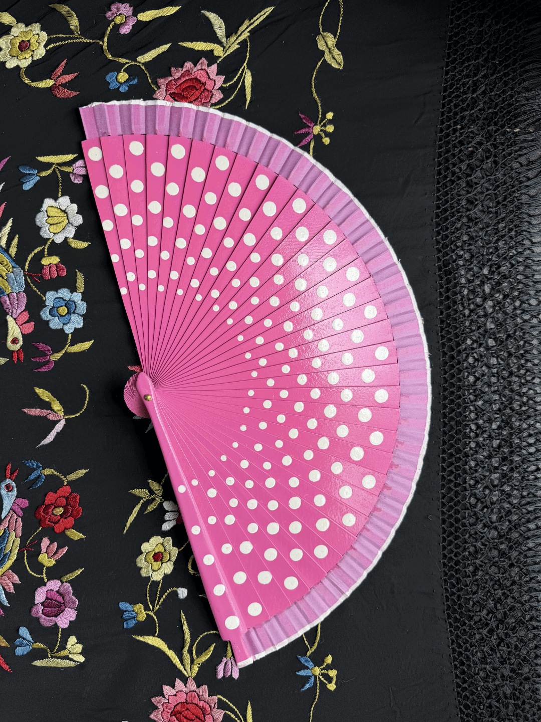 Abanico español de 23 cm pintado a mano de ambos lados. Seleccionado especialmente para baile flamenco.