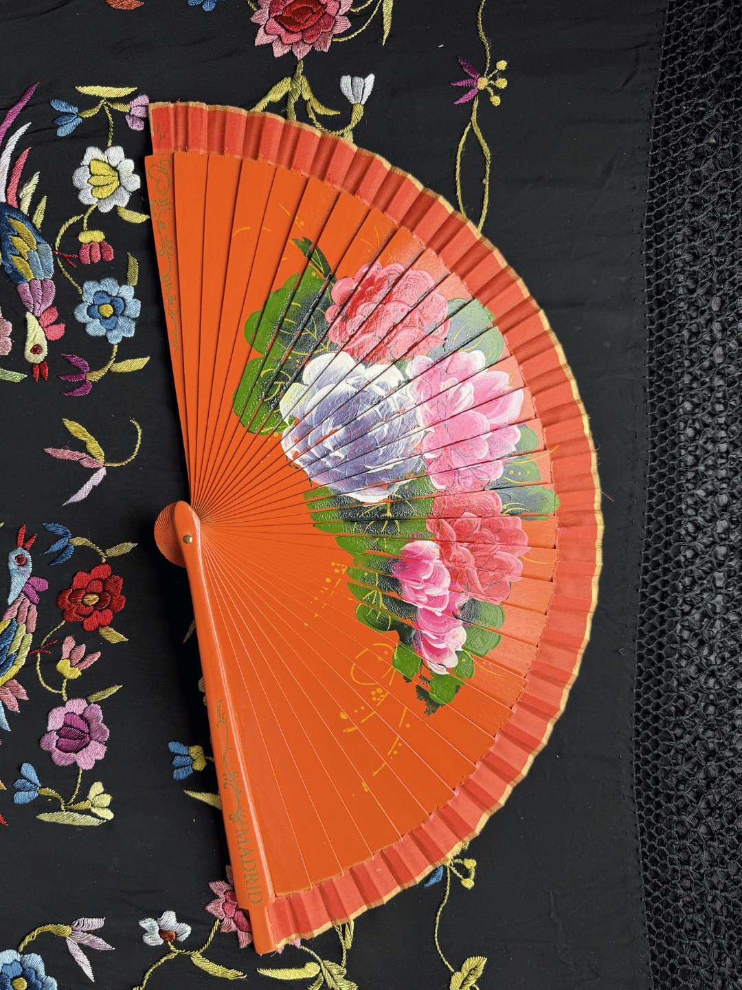 Abanico español de 23 cm pintado a mano de ambos lados. Seleccionado especialmente para baile flamenco.