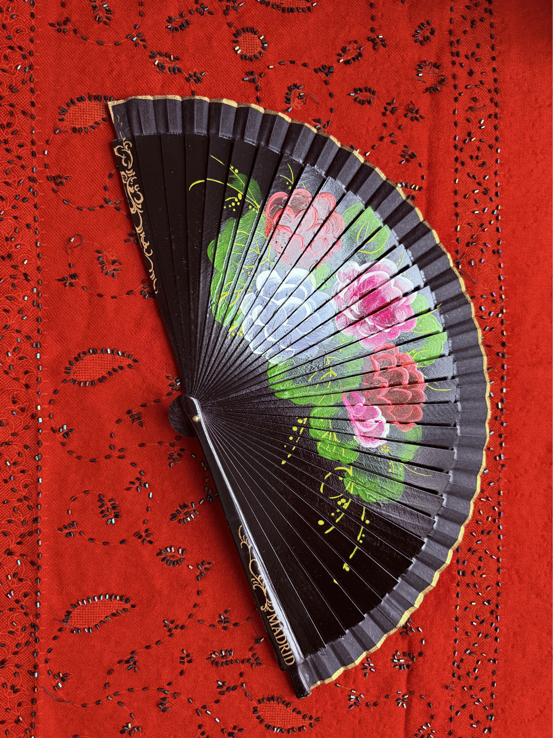 Abanico español de 23 cm pintado a mano de ambos lados. Seleccionado especialmente para baile flamenco.