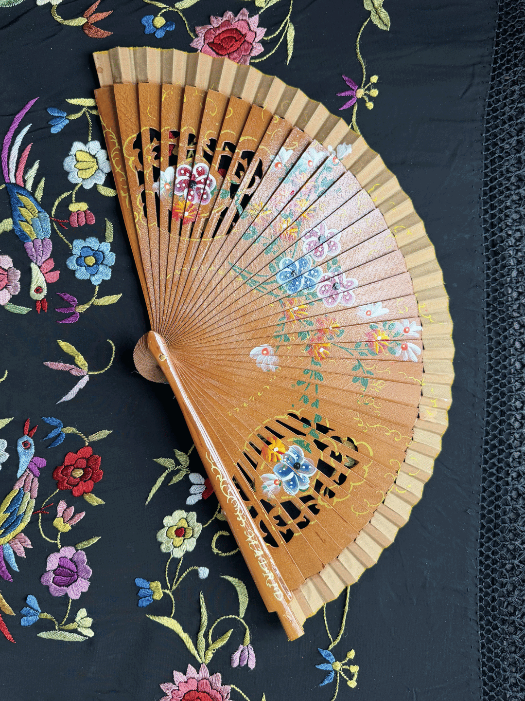 Abanico español de 23 cm pintado a mano de ambos lados. Seleccionado especialmente para baile flamenco.