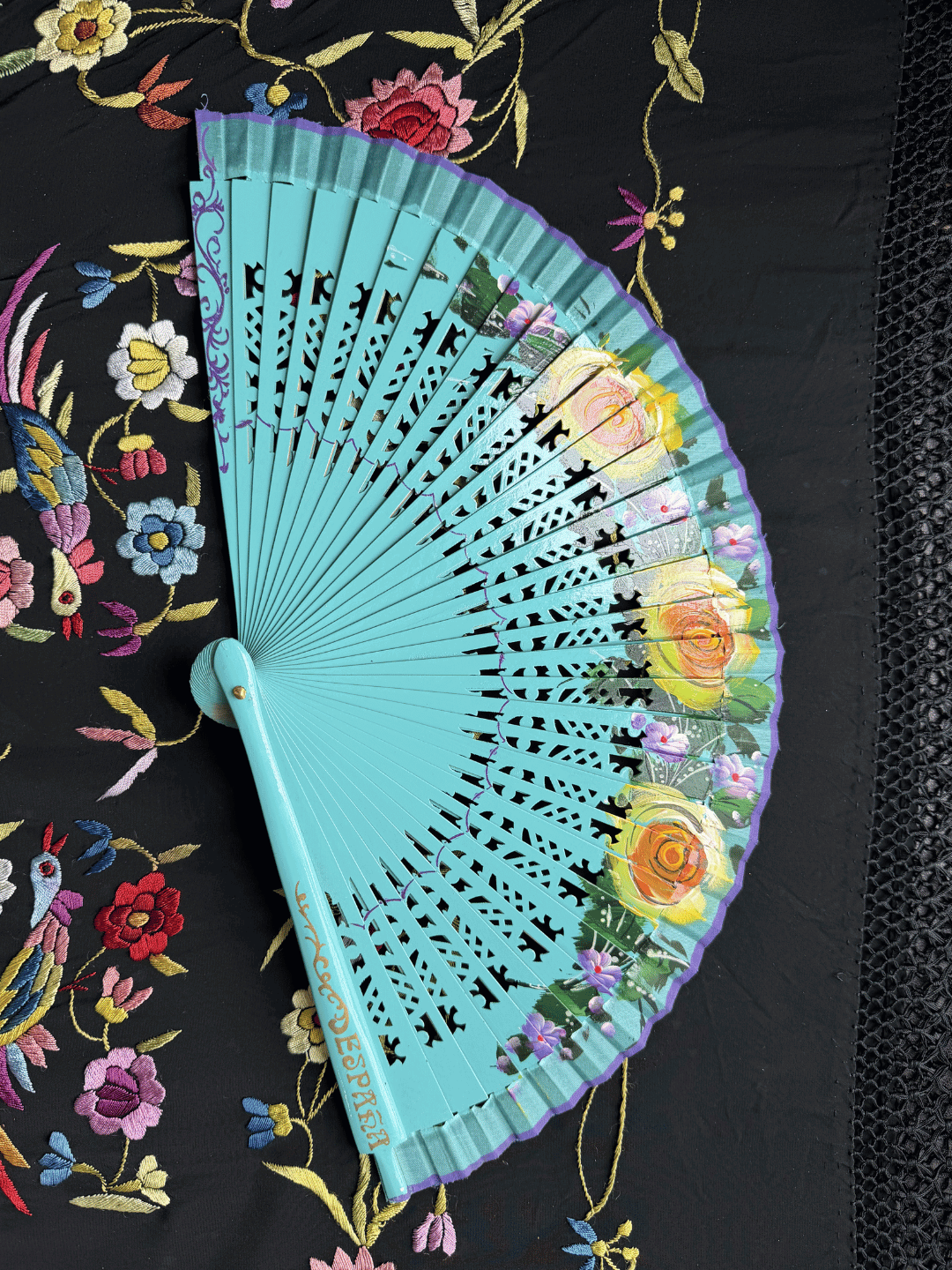 Abanico español de 23 cm pintado a mano de ambos lados. Seleccionado especialmente para baile flamenco.