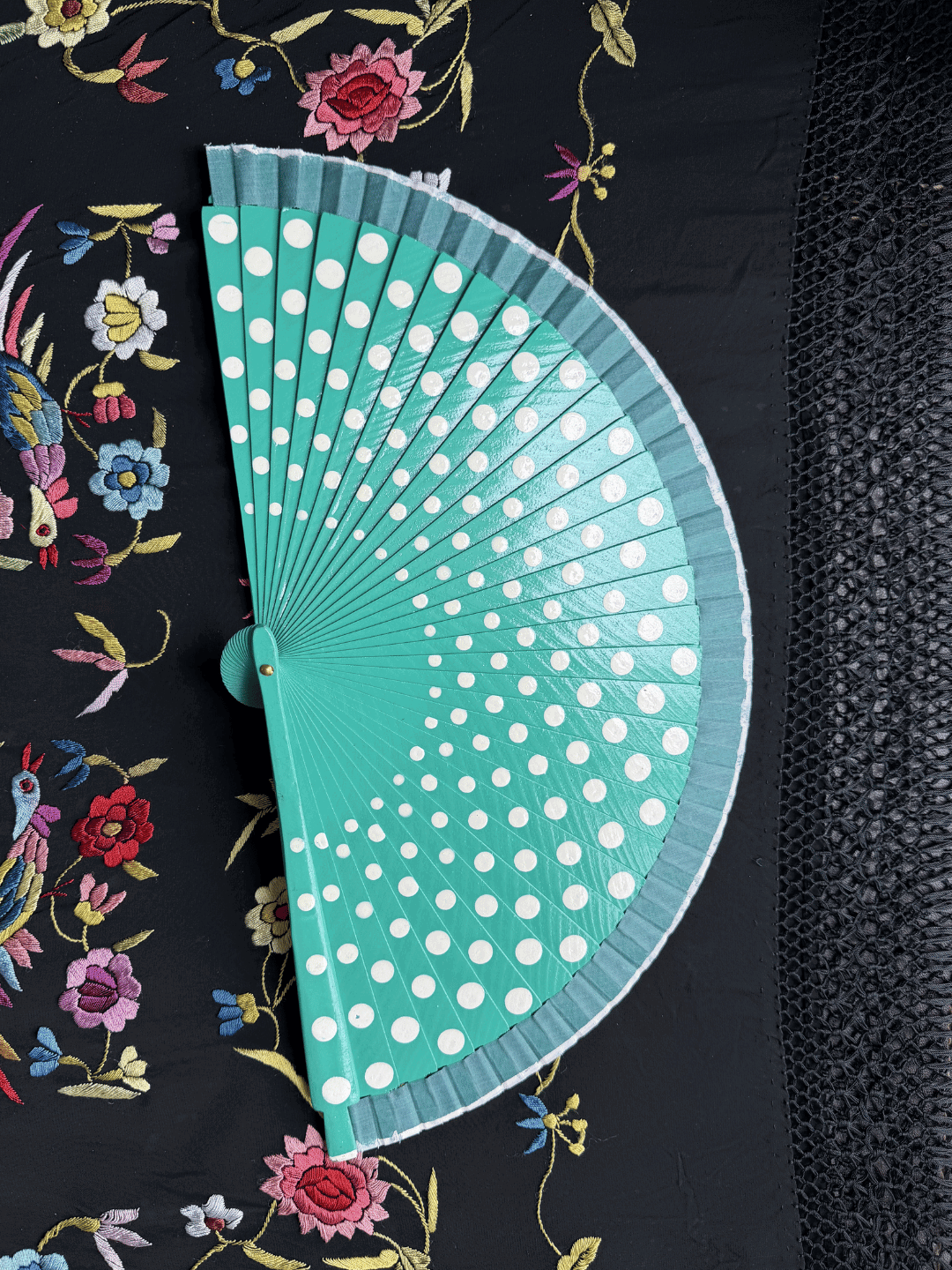 Abanico español de 23 cm pintado a mano de ambos lados. Seleccionado especialmente para baile flamenco.