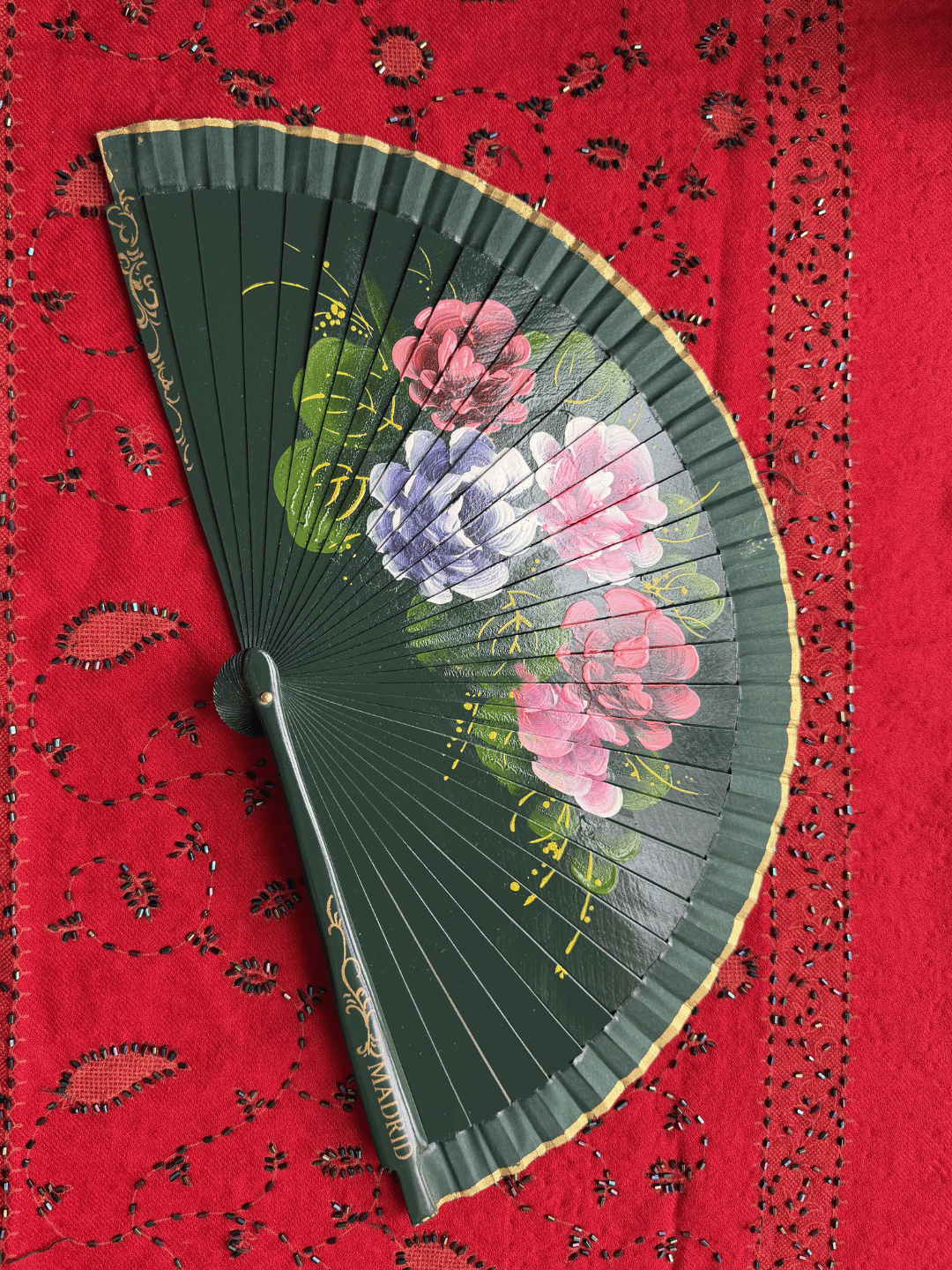 Abanico español de 23 cm pintado a mano de ambos lados. Seleccionado especialmente para baile flamenco.