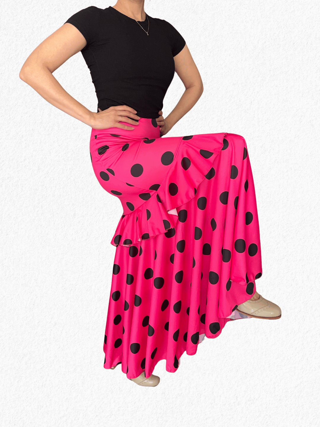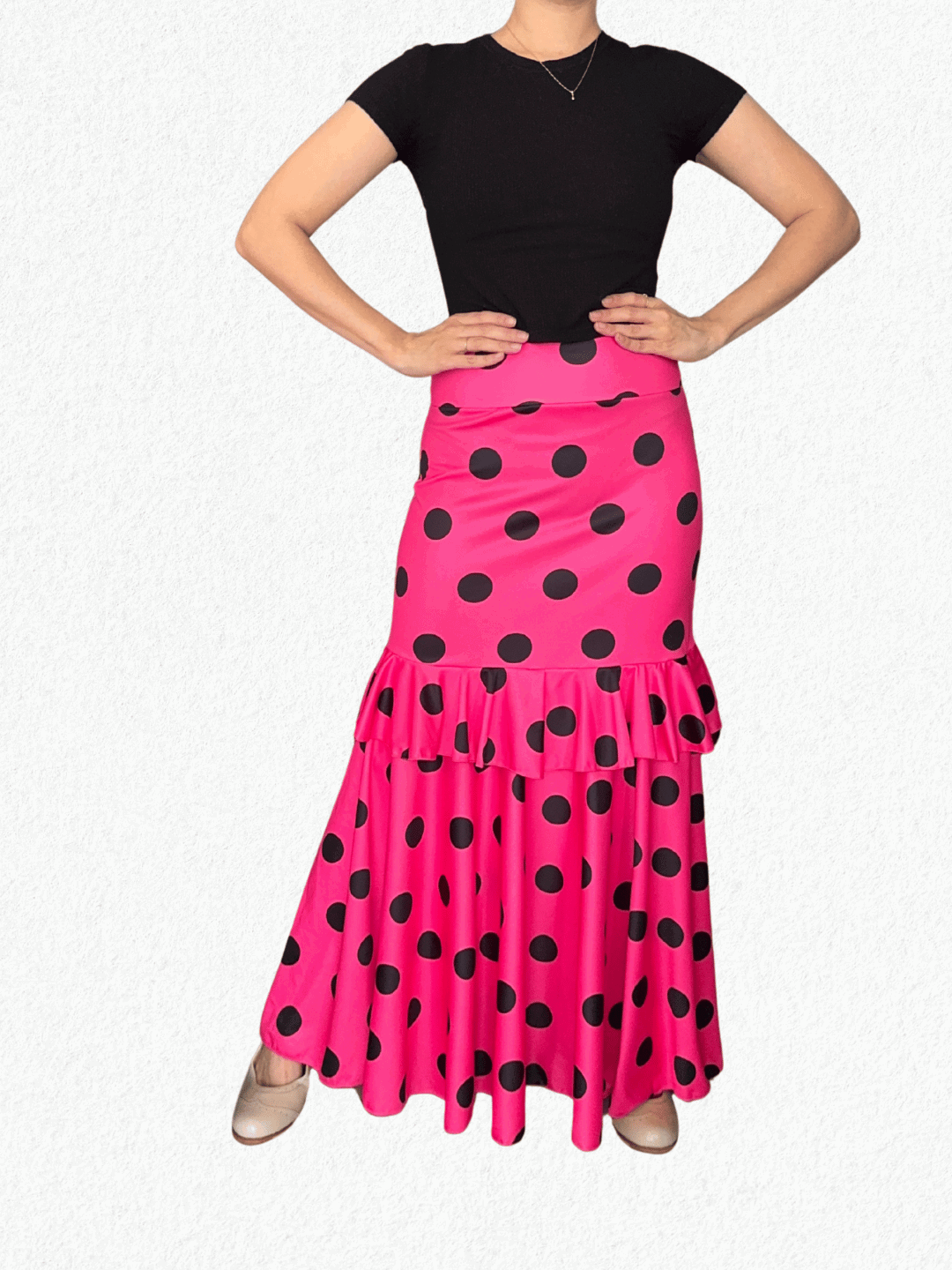 Yo uso talle M y esta falda me queda perfecta, bien al cuerpo. Considero que, si sos talle S, también podría quedarte bien. Le tomé las medidas sobre una mesa y son: cintura 37 cm, cadera 48 cm y largo 108 cm. Usá como referencia una falda propia.