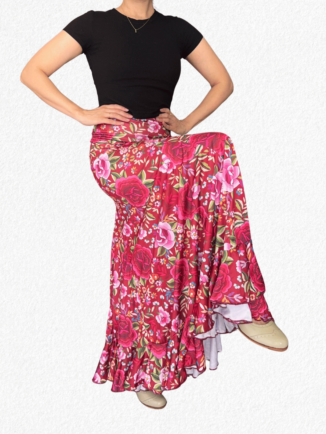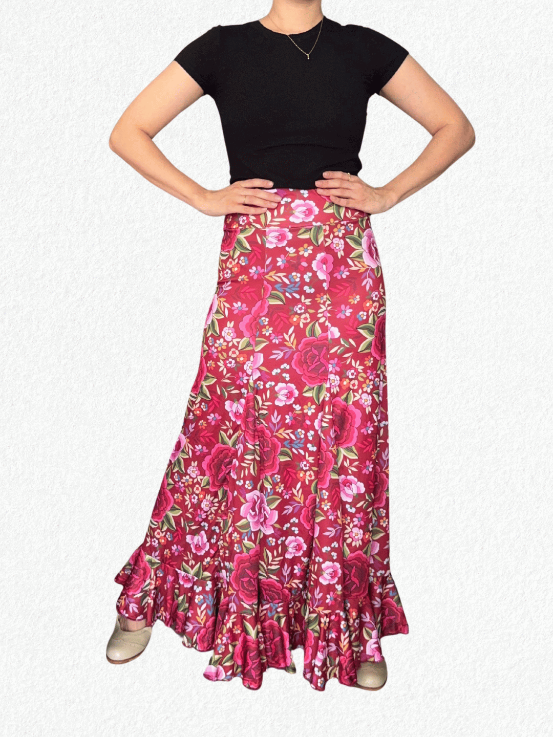 Le tomé las medidas sobre una mesa y son: cintura 38 cm, cadera 46 cm y largo 108 cm. Usá como referencia una falda propia.