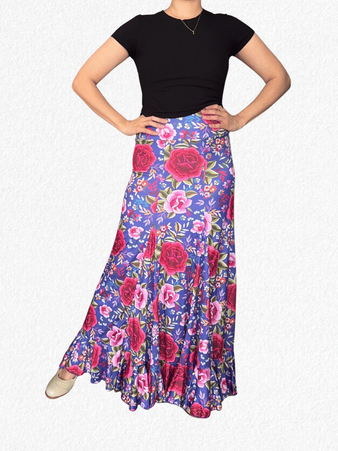 Yo soy talle M y en la foto estoy usando una talle 2. Le tomé las medidas sobre una mesa y son: cintura 33 cm, cadera 42 cm y largo 107 cm. Usá como referencia una falda propia. Material: jersey.