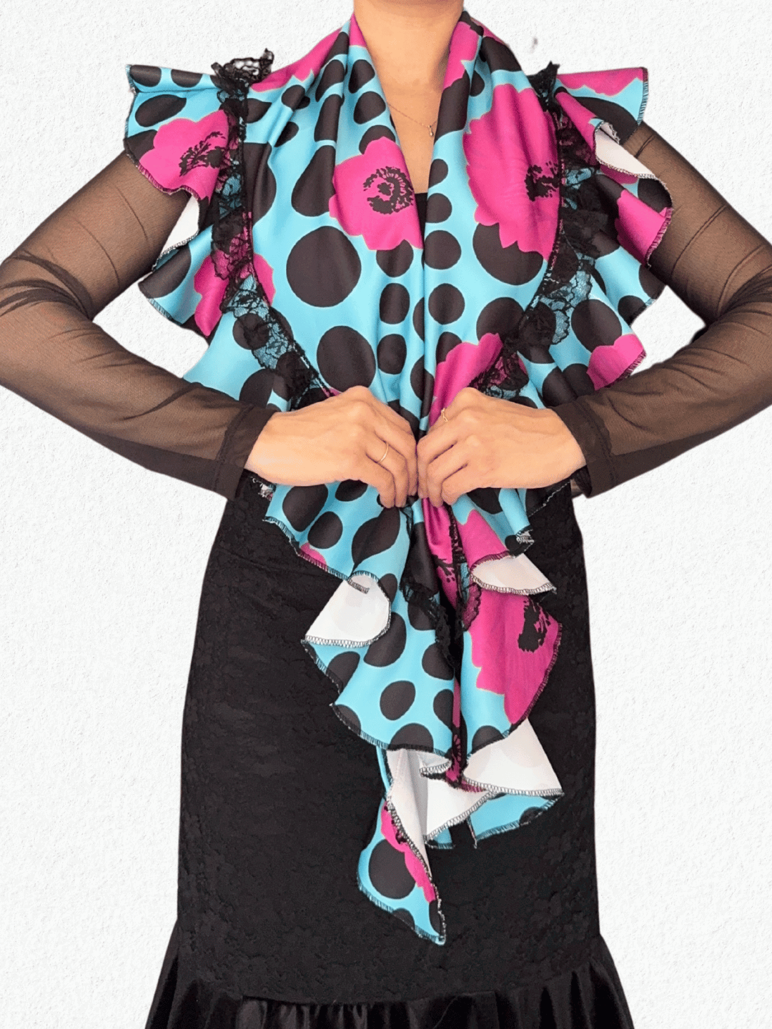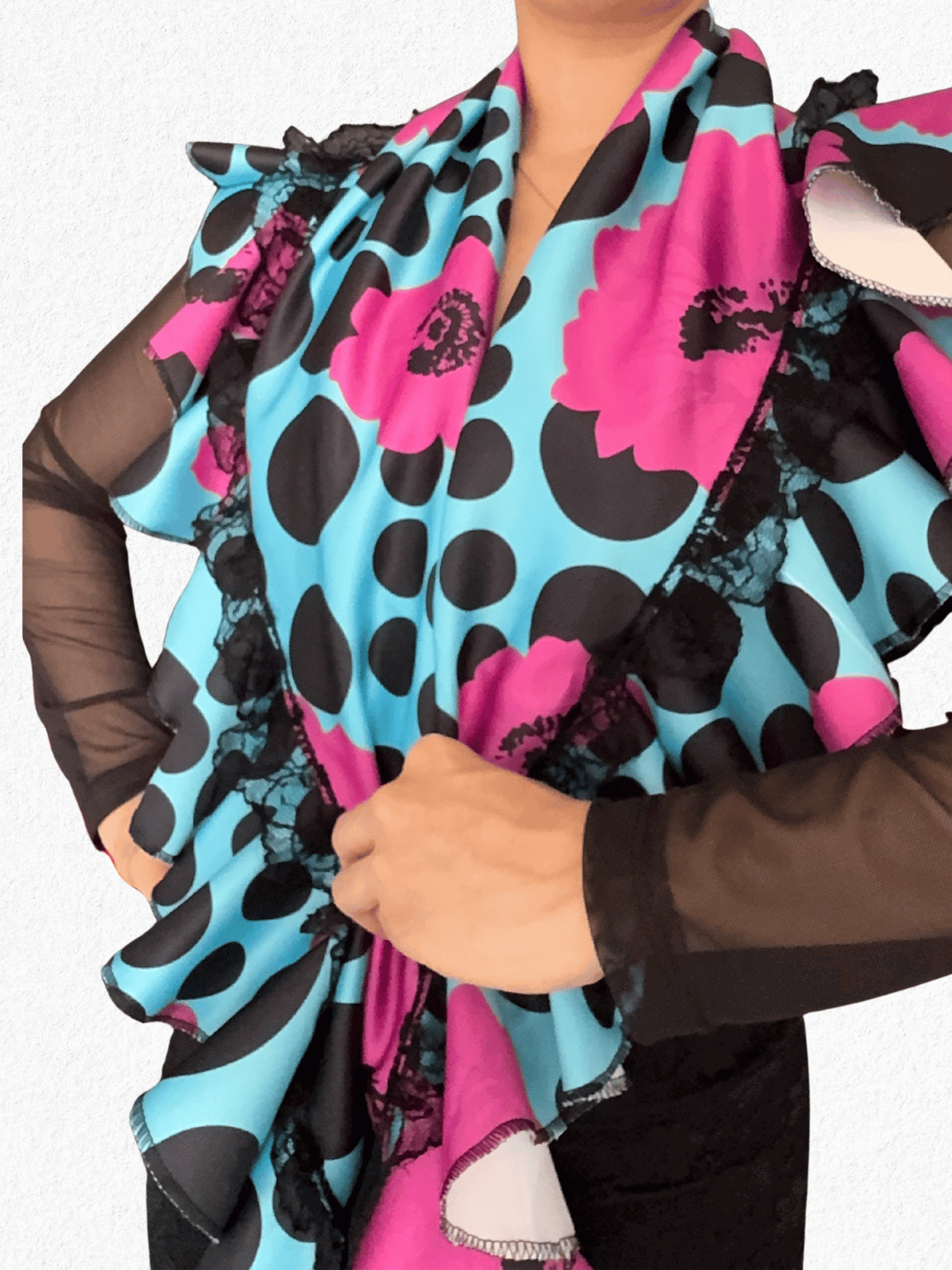 ¡Este pico es hermoso y la tela la compré en Sevilla! Las medidas son: base del triangulo 150 cm, largo de la base al pico 36 cm, volados 10 cm. No te olvides de ponerle un broche para darle el toque final.