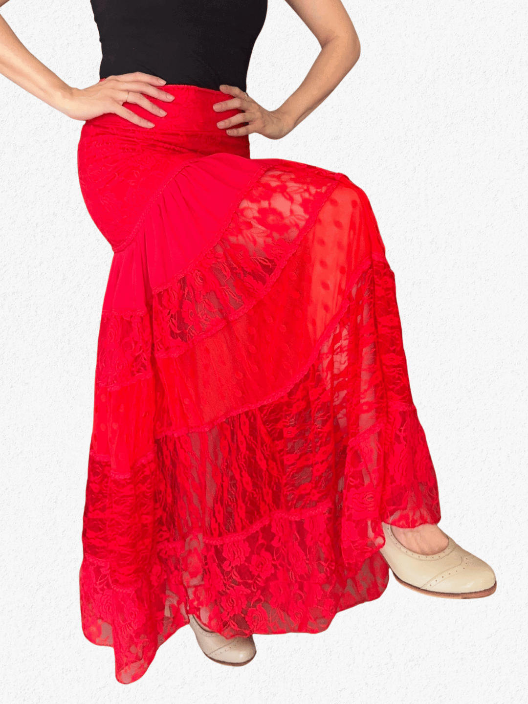 Le tomé las medidas sobre una mesa y son: cintura 35 cm, cadera 49 cm y largo 107 cm. Usá como referencia una falda propia.Material de la parte superior: encaje elastizado forrado.
